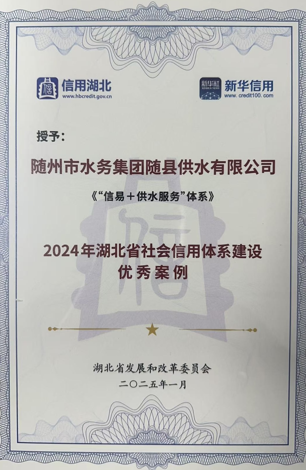 在2024年湖北省社會信用體系建設(shè)典型案例評選中,隨州市水務(wù)集團(tuán)有限公司憑借創(chuàng)新實踐項目《“信易+供水服務(wù)”體系》,成功榮膺全省優(yōu)秀案例獎。這一殊榮既是對隨州水務(wù)集團(tuán)創(chuàng)新服務(wù)成效的認(rèn)可,更是為社會信用建設(shè)和營商環(huán)境優(yōu)化注入強勁動能,進(jìn)一步激活創(chuàng)新發(fā)展新勢能。
