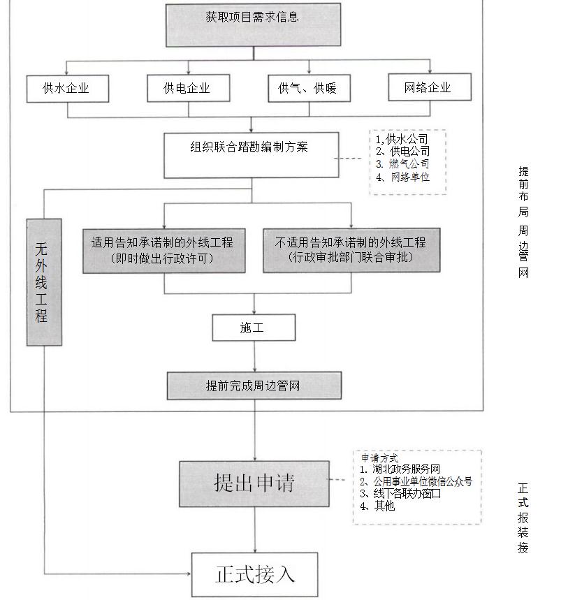 ( 一) 一 口登記早服務(wù)。 新建投資項目在土地出讓階段, 隨同填寫《用戶獲得水、電、氣、網(wǎng)、暖需求信息采集單》, 對新建項目施工和生產(chǎn)所需的用水、用電、用氣、用網(wǎng)、用暖 需求進行意向登記。將項目報裝需求通過湖北政務(wù)服務(wù)網(wǎng)、工 改平臺傳遞給各公用事業(yè)單位,公用事業(yè)單位聯(lián)合上門對接, 根據(jù)用戶需求提前布局項目周邊區(qū)域管網(wǎng),為用戶后續(xù)獲得水、電、氣、網(wǎng)、暖接入作好準(zhǔn)備。