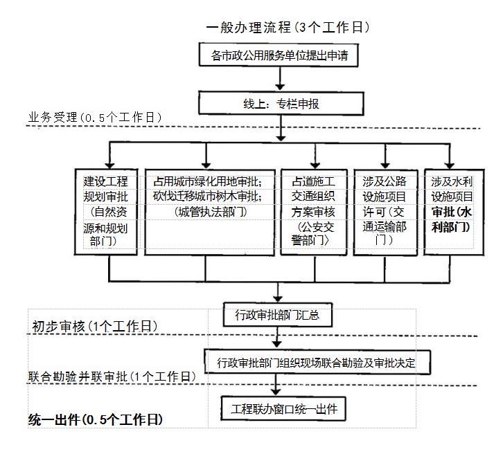 并聯(lián)審批辦理總時(shí)限:告知承諾制項(xiàng)目無(wú)需批前審批,由城 管、交通、公安審批部門加強(qiáng)現(xiàn)場(chǎng)實(shí)施監(jiān)管;一般審批項(xiàng)目3個(gè) 工作日(不含方案和評(píng)價(jià)報(bào)告編制時(shí)間、方案評(píng)審時(shí)間、申請(qǐng)人修改、審批前公示或公證時(shí)間)。